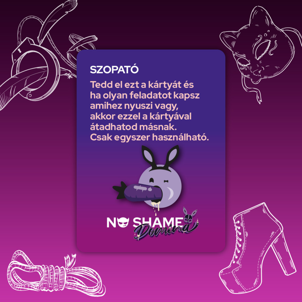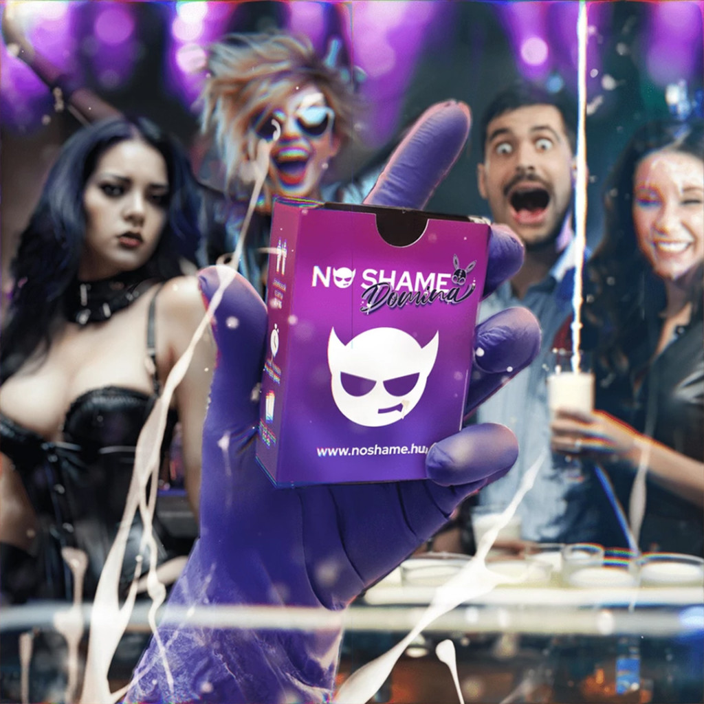 A No Shame Domina nem csak egy egyszerű party kártyajáték. Ezzel a paklival megtudhatod, meddig vagy hajlandó elmenni a győzelemért. Annyira kemény feladatok vannak benne, hogy nem találtunk 7 kártyát, amit ki tehetnénk ide, úgyhogy az utolsót már ki kellett cenzúráznunk. Se 18 év alatt, se felett nem ajánlott és főleg nem szülői felügyelettel. A nyertes az, akinek megmarad az ép elméje az este végéig. Tegyétek gyorstárcsázóra a 112-t és a pszichológusotokat, töltsétek tele a poharakat, lazítsátok el az állkapcsotokat és kezdjétek el életetek legdurvább játékát, amiről biztos nem fogtok mesélni az unokáitoknak. Nincsenek határok, nincs józan ész, nincs szégyen.