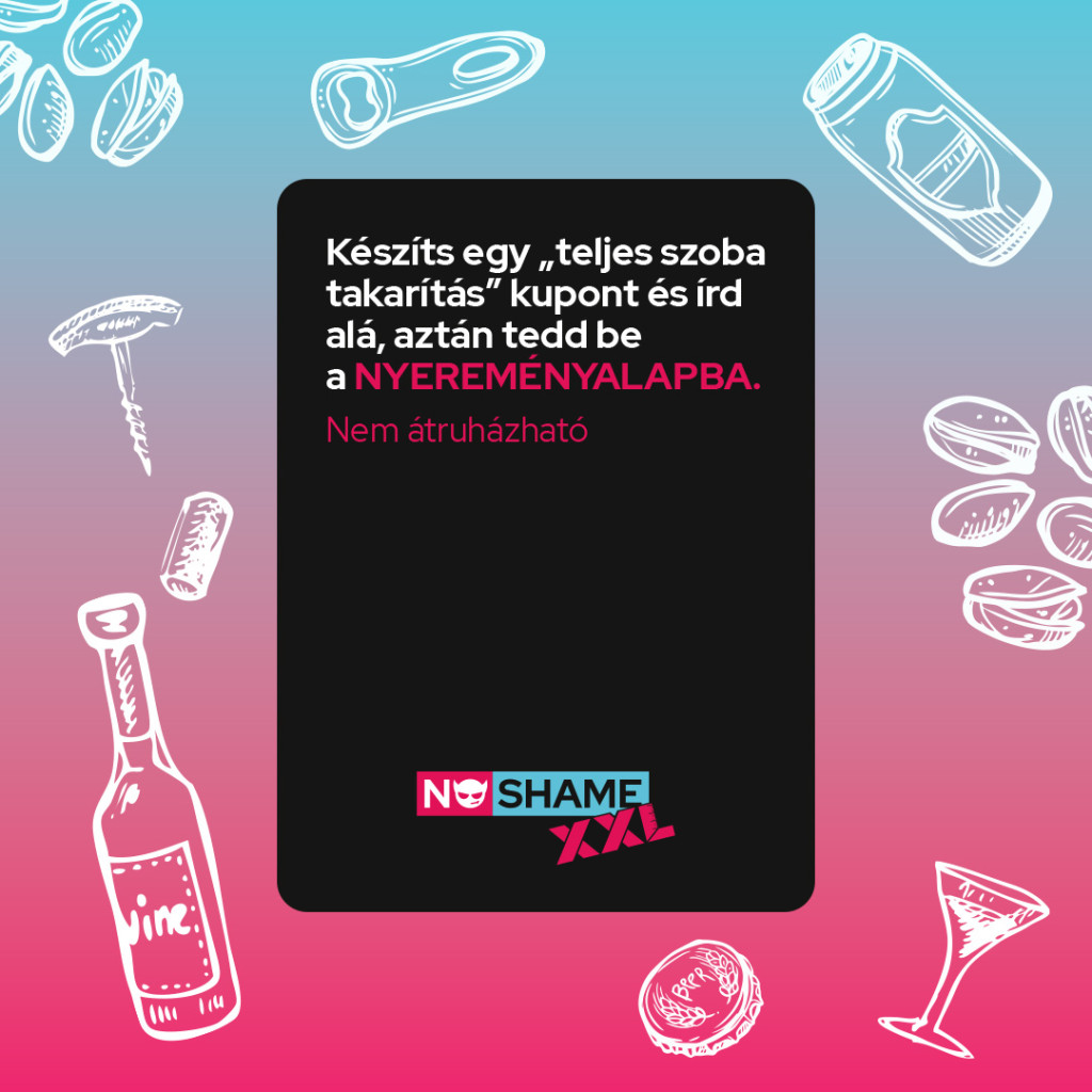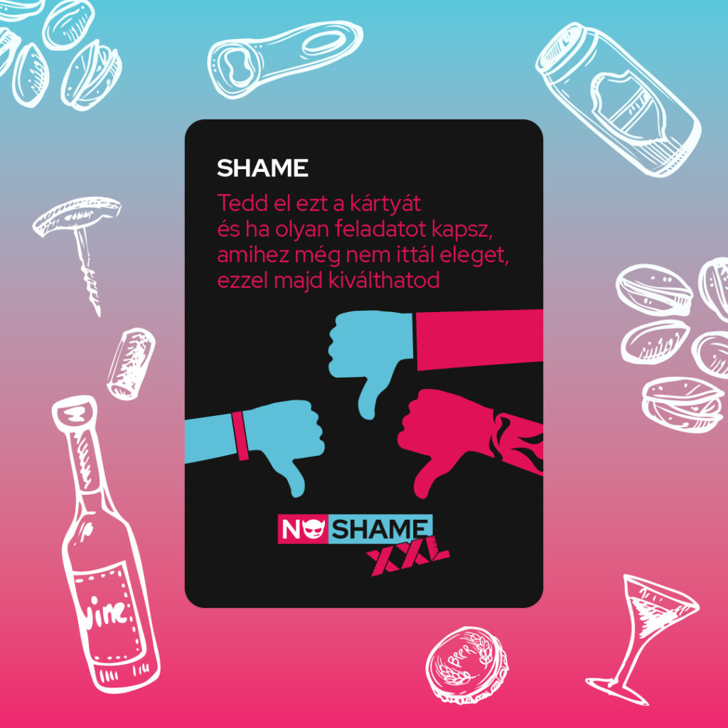 Ez az EREDETI No Shame játék. Csak a legbevállalósabb nyerhet, aki bármit megcsinál és nem szégyell semmit. A No Shame XXL nem csak egy egyszerű ivós társasjáték. Ennek a 252 db kártyának hatalma van! Ezek a kártyák összehoznak a crushoddal. Ezek a kártyák megváltoztatják az életedet. Ezek a kártyák olyan vad bulit csinálnak, amit soha nem fogtok elfelejteni. A játékban az lesz a győztes, aki mindent bevállal.